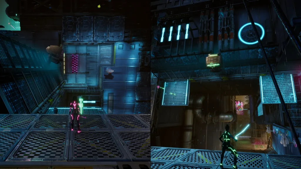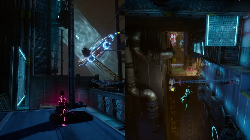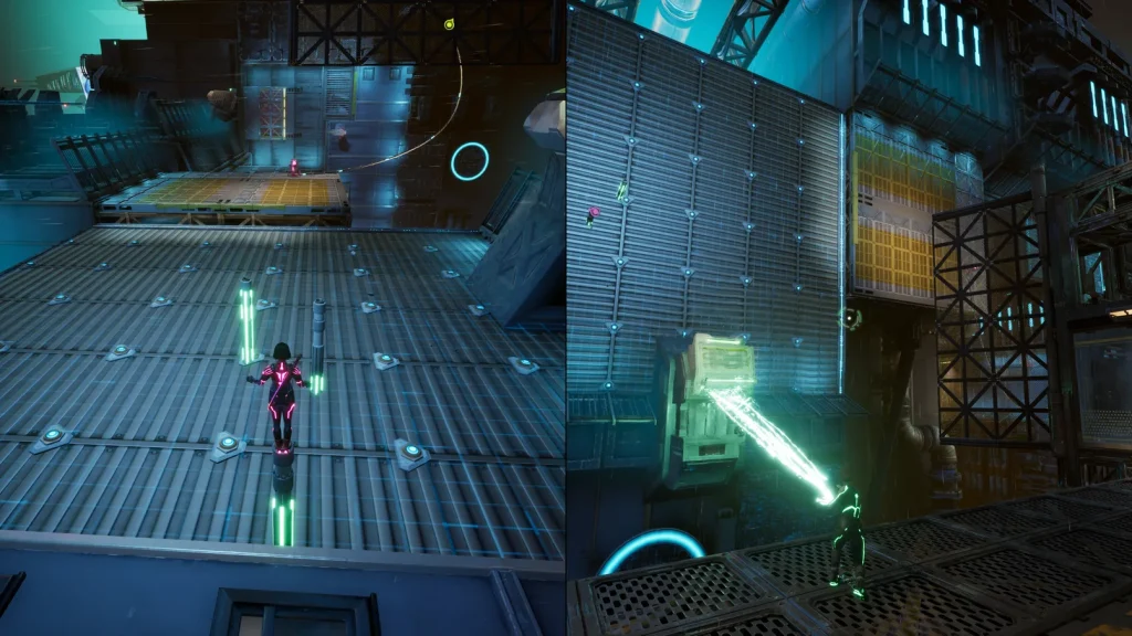 Следващият участък изисква още по-добра координация между двамата. Пред Мио ще има два розови контейнера на известно разстояние един от друг по протежение на коридор. Атакуването на тези превключватели освобождава ръкохватки по стената, които Зоуи може да използва с лазерния си камшик, за да се залюлее и да премине. Но ръкохватките не остават активирани дълго. Като Мио, ще трябва да атакувате един превключвател, след това да спринтирате и да се втурнете, за да ударите следващия. Зоуи трябва да започне да се люлее веднага след натискането на първия превключвател и когато умението може да се използва.